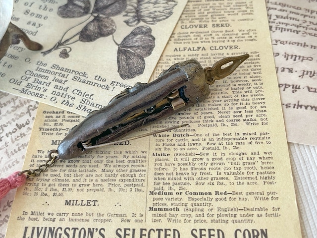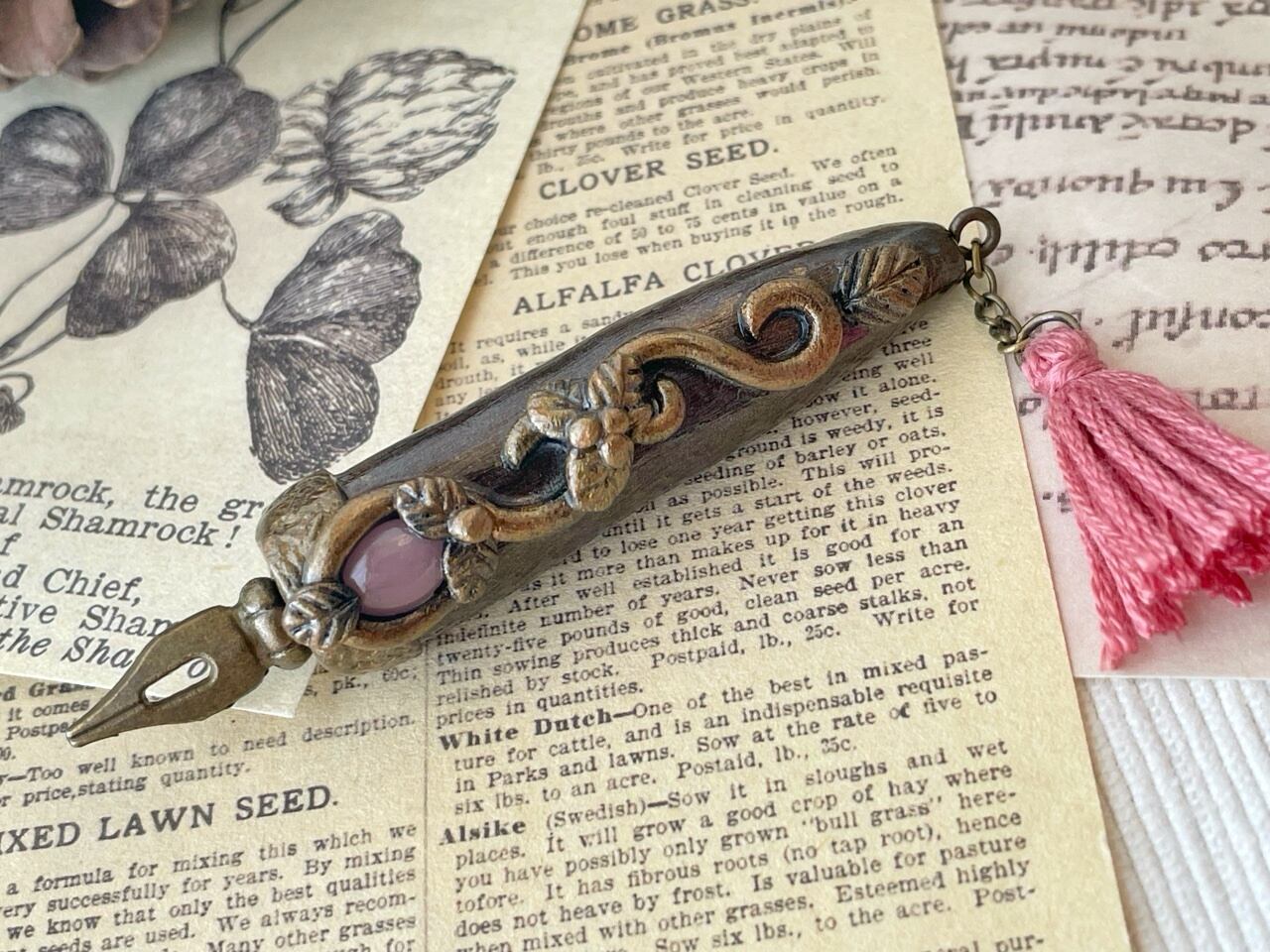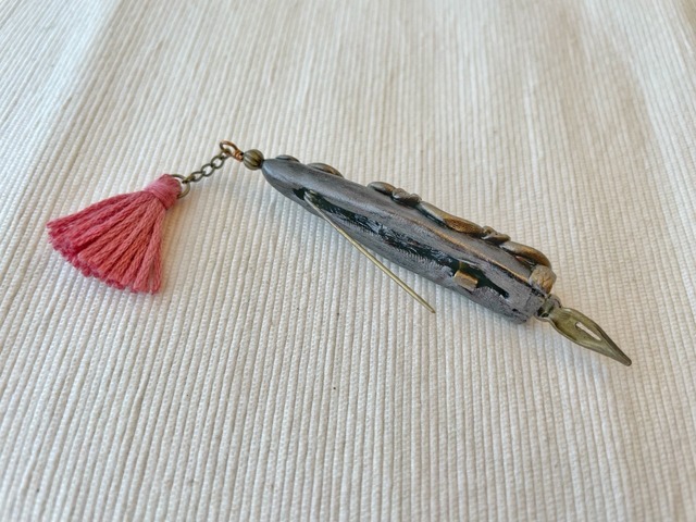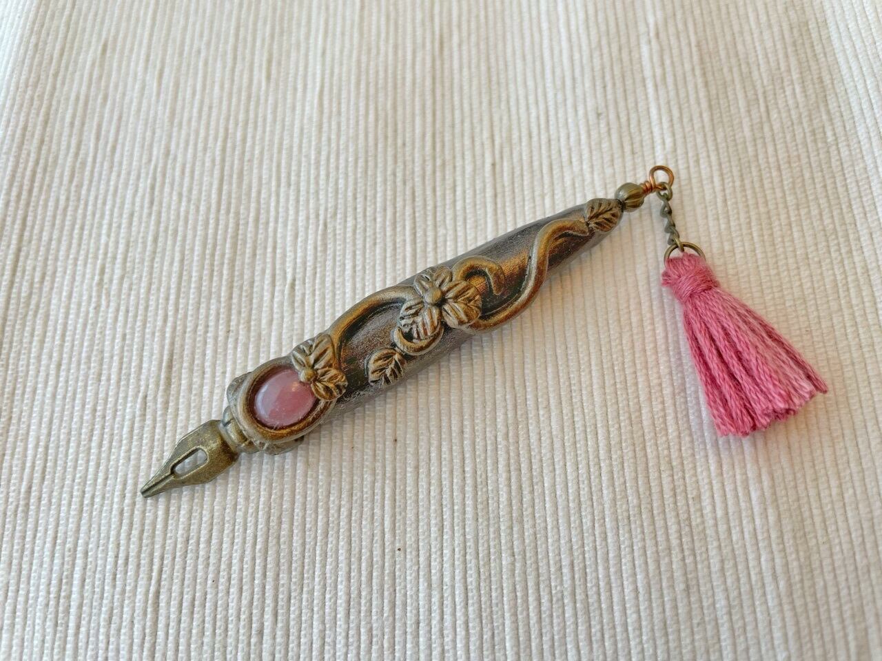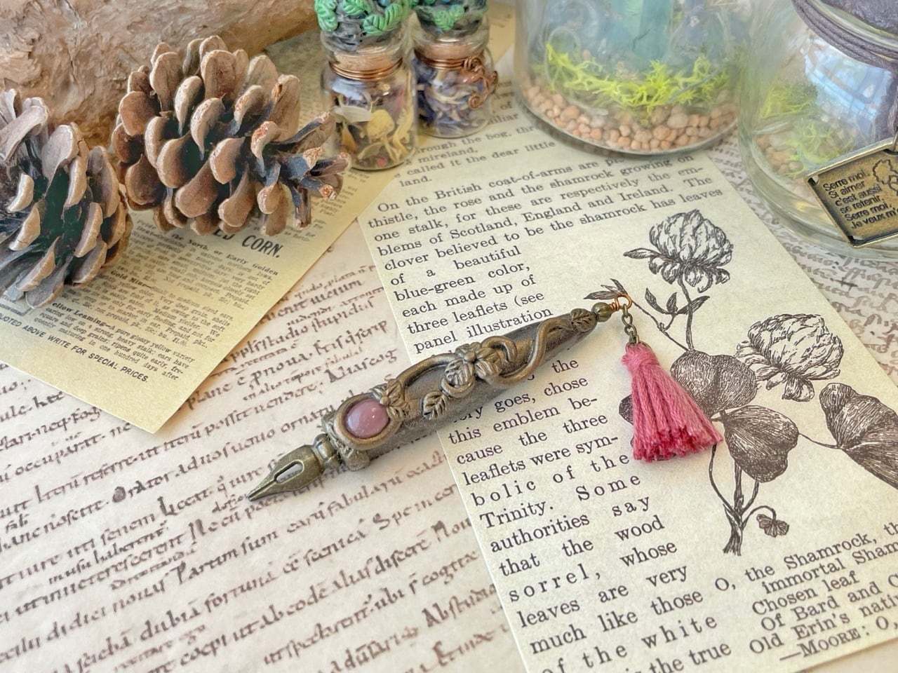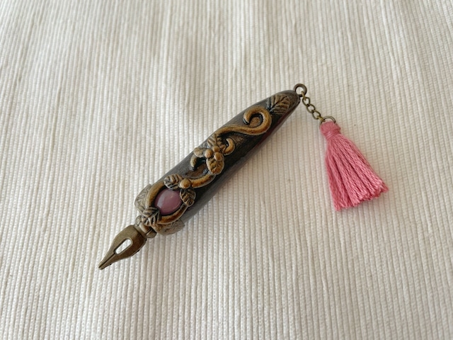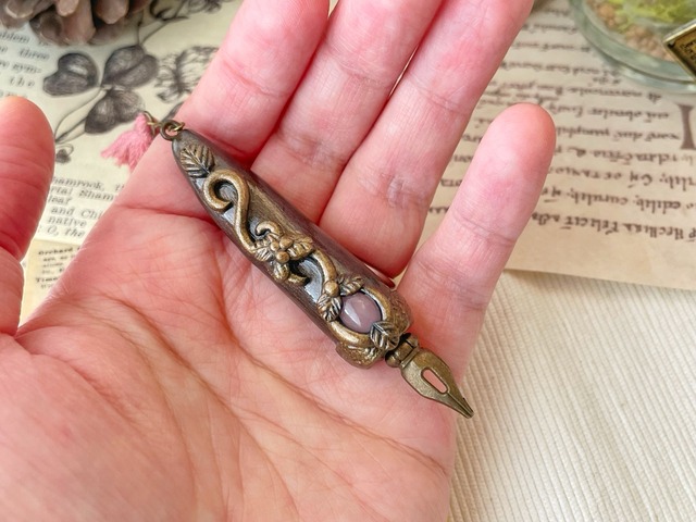 魔法式や魔法陣を描くために錬成された魔法使い用のペンを納品したところ、ジャーナリストの皆様から「いつでもすぐにメモが取れるようにコンパクトなサイズのペンを作って欲しい」との要望を受け誕生しました。ブローチ型となっておりますので、胸元や帽子に付けた状態で持ち運びできます。皆様のスクープ記事をお待ちしております♪