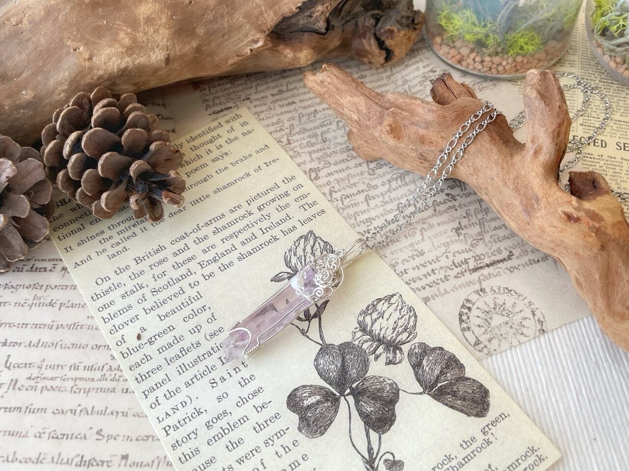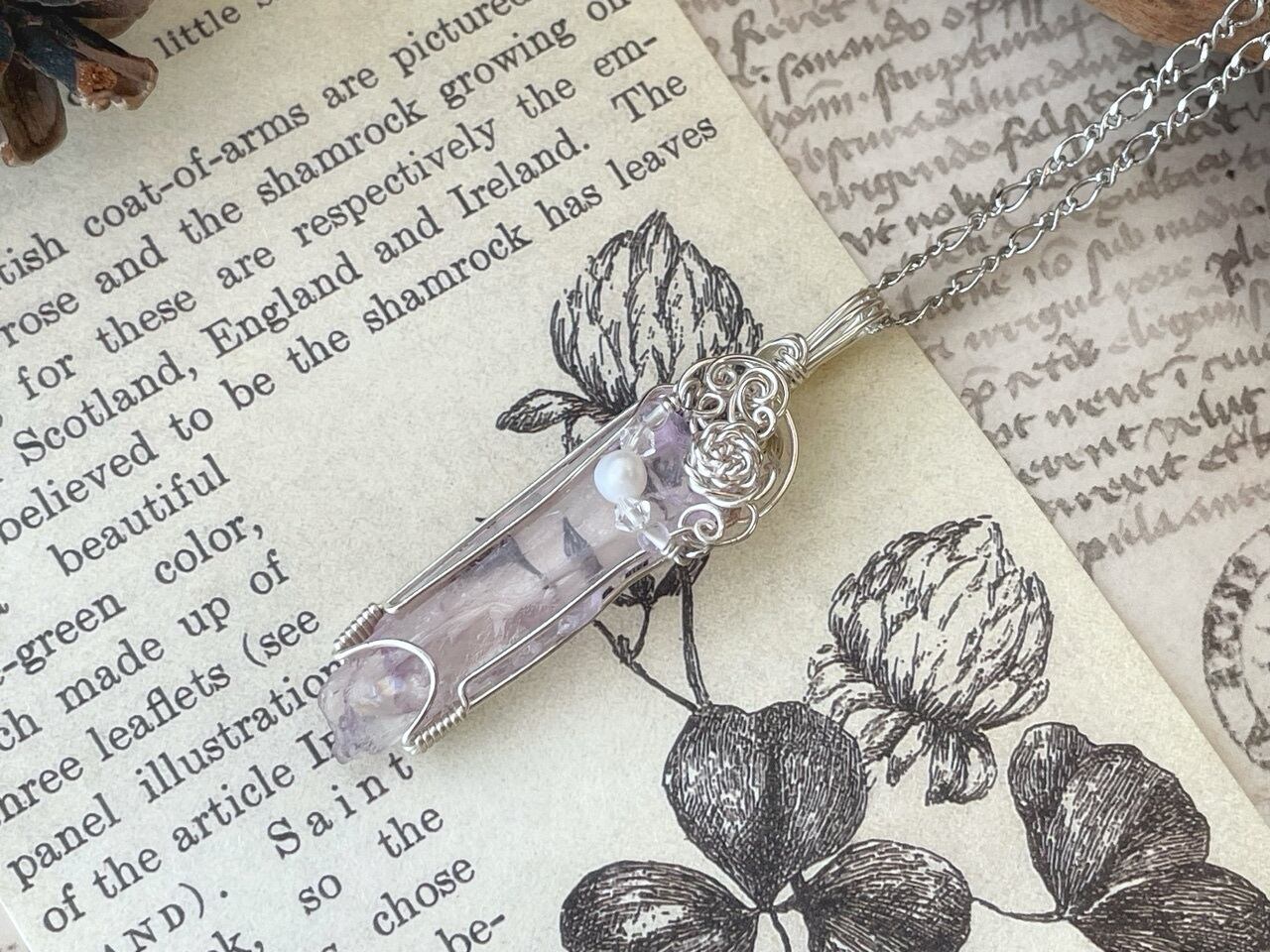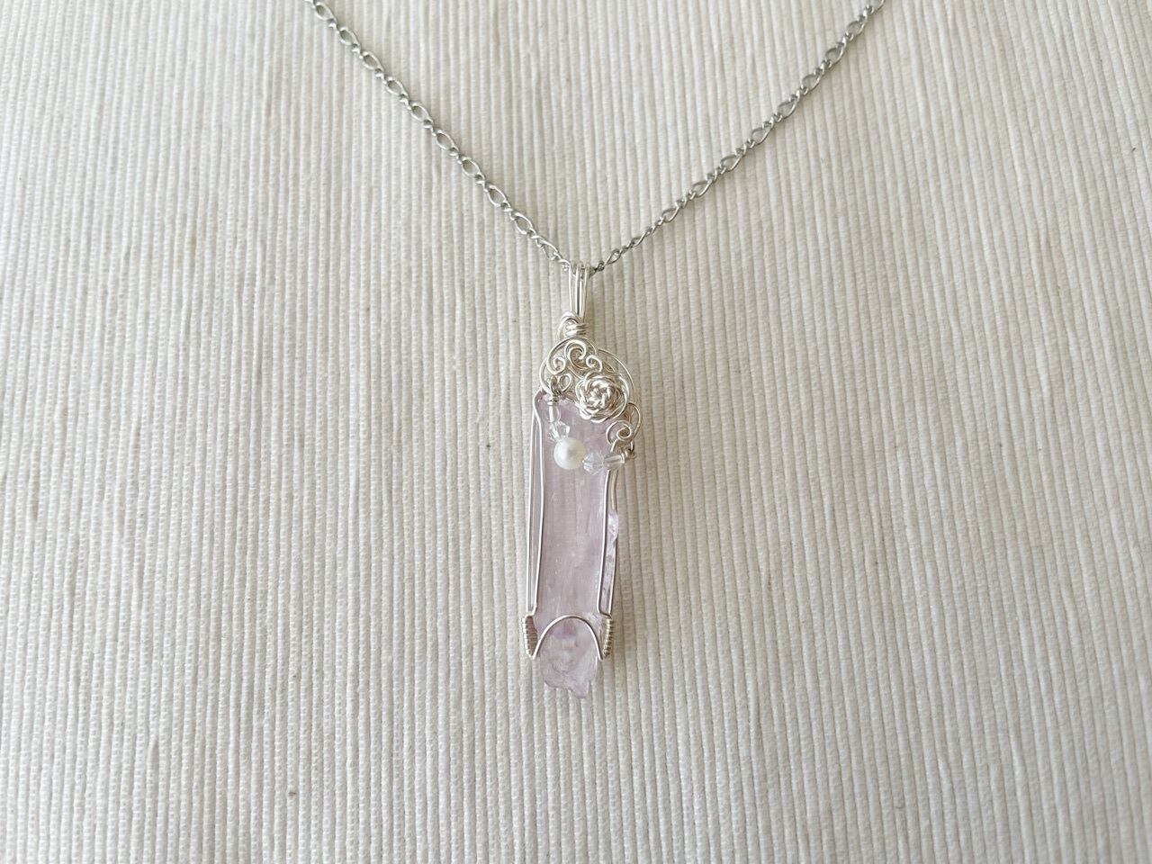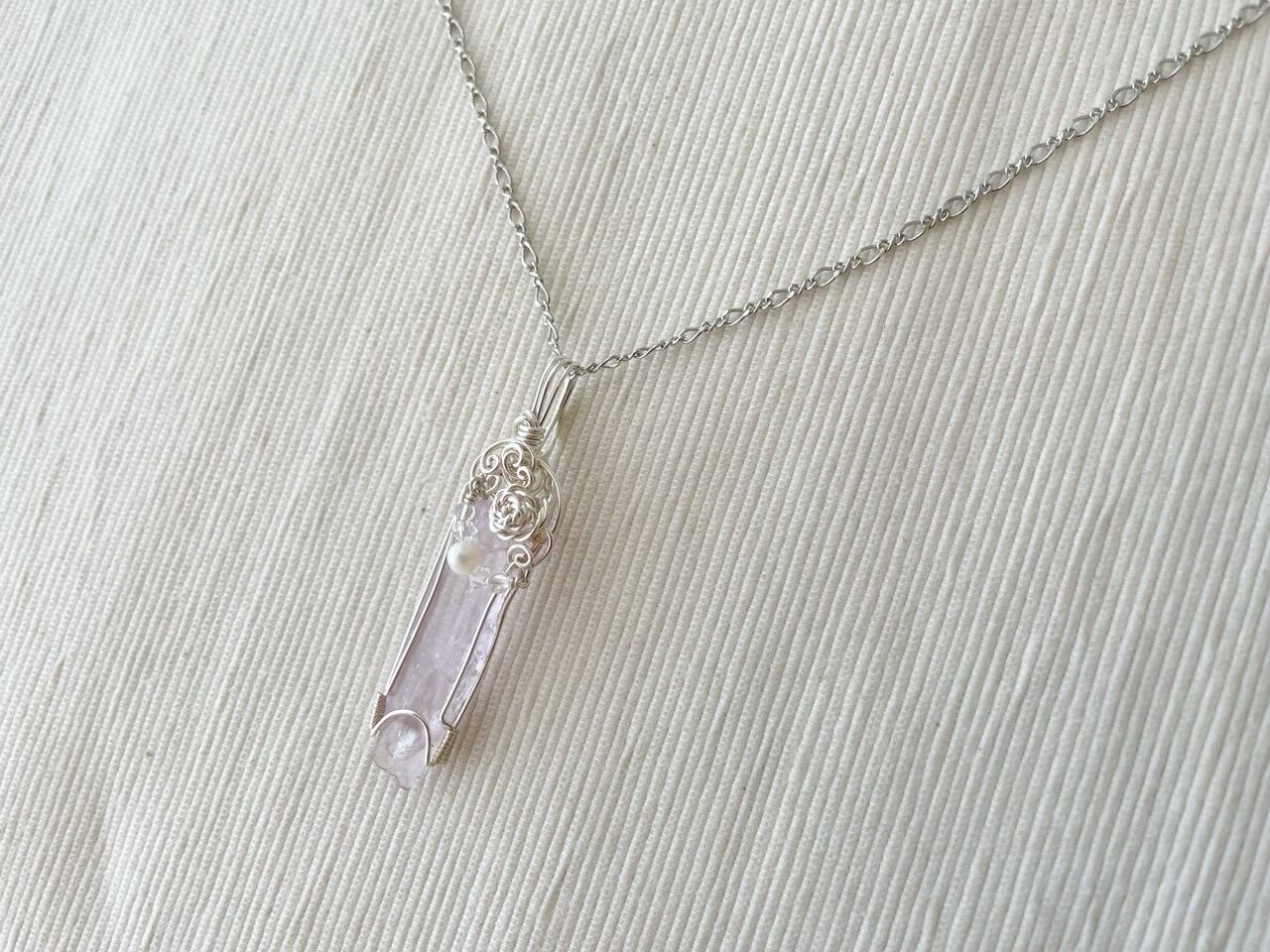 透明度の高いライラックピンクが儚げなクンツァイト原石をワイヤー加工したペンダントです。白銀色の小さな薔薇モチーフと淡水パールが可憐な彩りを添えています。