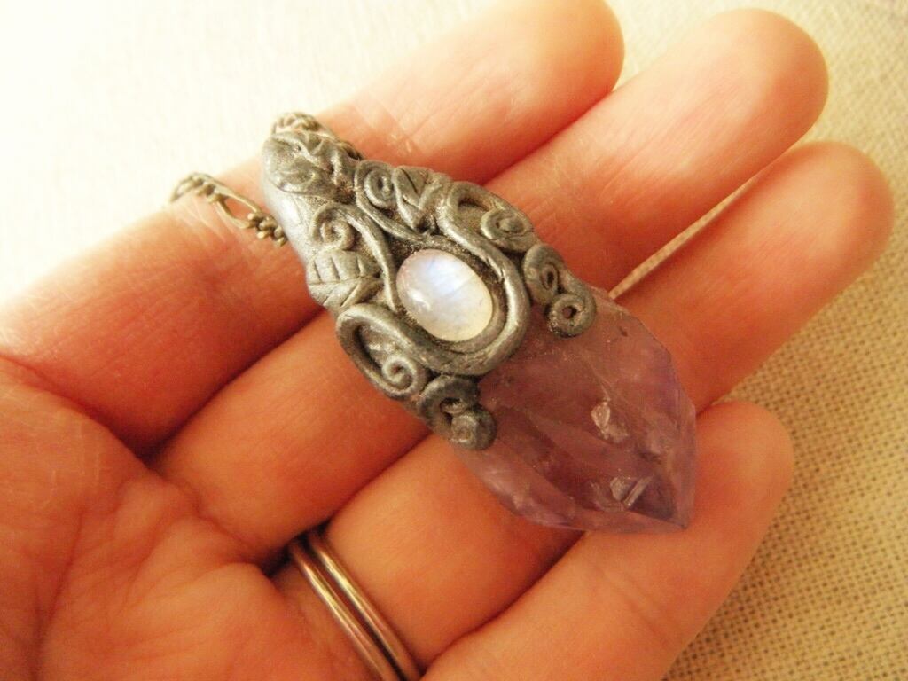 アメジストの原石にムーンストーンのカボションを組み合わせたペンダントです。思わず冒険の旅に出たくなりそう!?ズシリとした存在感のある一品です。