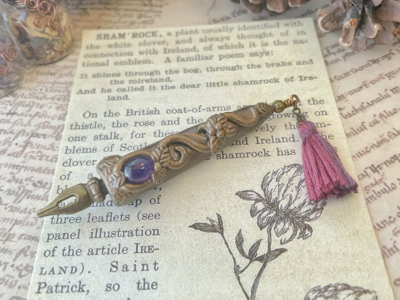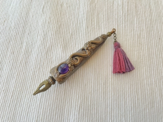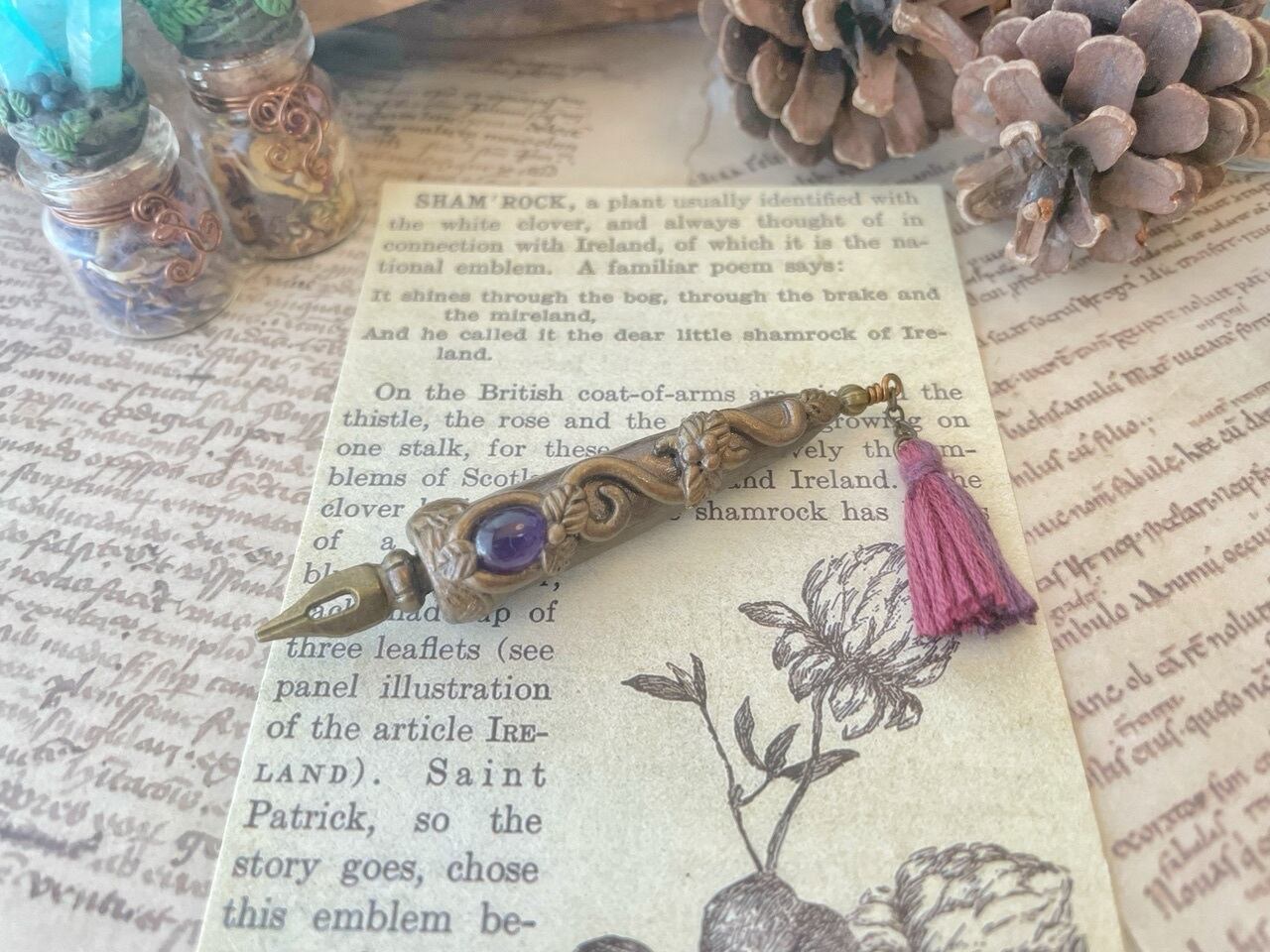 魔法式や魔法陣を描くために錬成された魔法使い用のペンを納品したところ、ジャーナリストの皆様から「いつでもすぐにメモが取れるようにコンパクトなサイズのペンを作って欲しい」との要望を受け誕生しました。ブローチ型となっておりますので、胸元や帽子に付けた状態で持ち運びできます。皆様のスクープ記事をお待ちしております♪