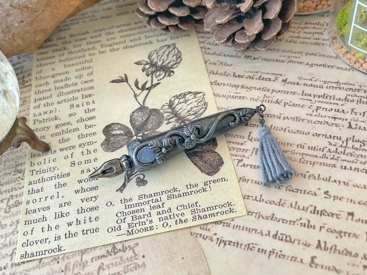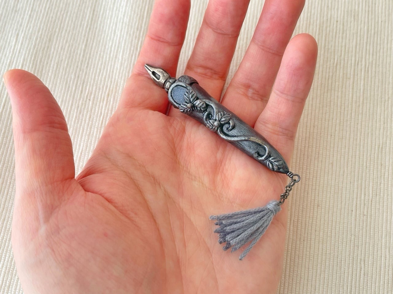 魔法式や魔法陣を描くために錬成された魔法使い用のペンを納品したところ、ジャーナリストの皆様から「いつでもすぐにメモが取れるようにコンパクトなサイズのペンを作って欲しい」との要望を受け誕生しました。ブローチ型となっておりますので、胸元や帽子に付けた状態で持ち運びできます。皆様のスクープ記事をお待ちしております♪