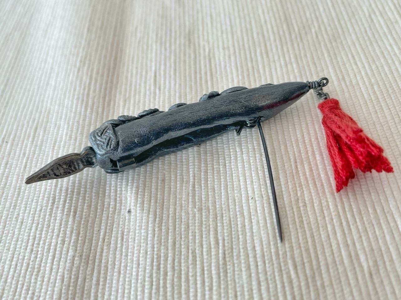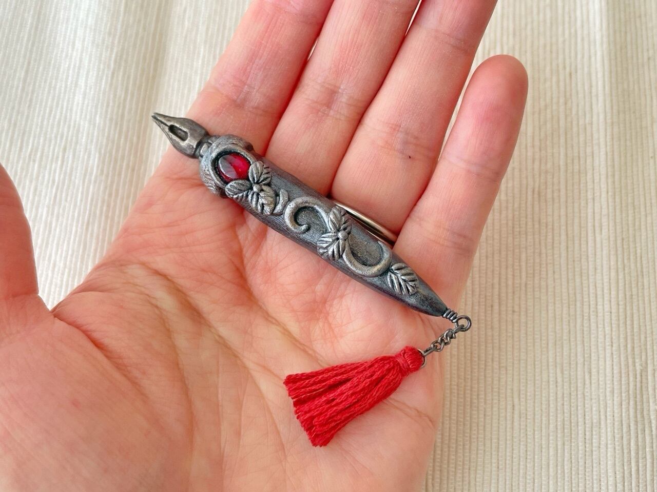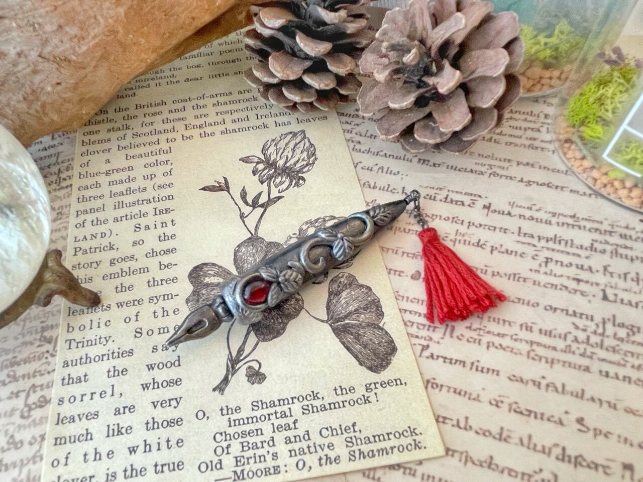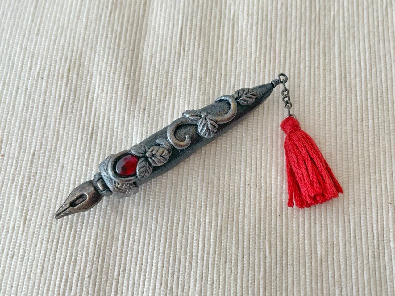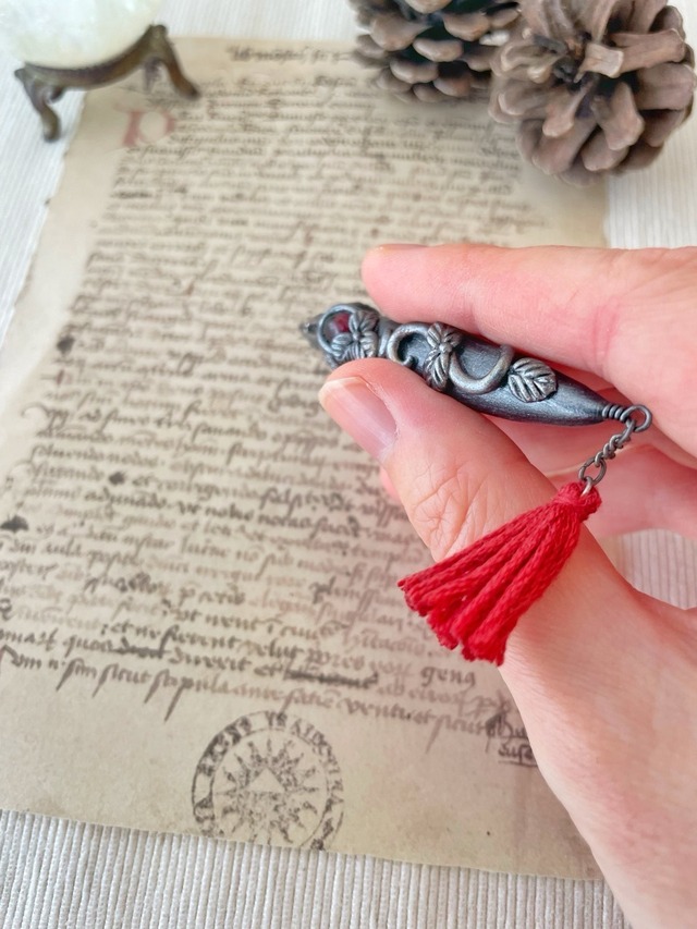 魔法式や魔法陣を描くために錬成された魔法使い用のペンを納品したところ、ジャーナリストの皆様から「いつでもすぐにメモが取れるようにコンパクトなサイズのペンを作って欲しい」との要望を受け誕生しました。ブローチ型となっておりますので、胸元や帽子に付けた状態で持ち運びできます。皆様のスクープ記事をお待ちしております♪