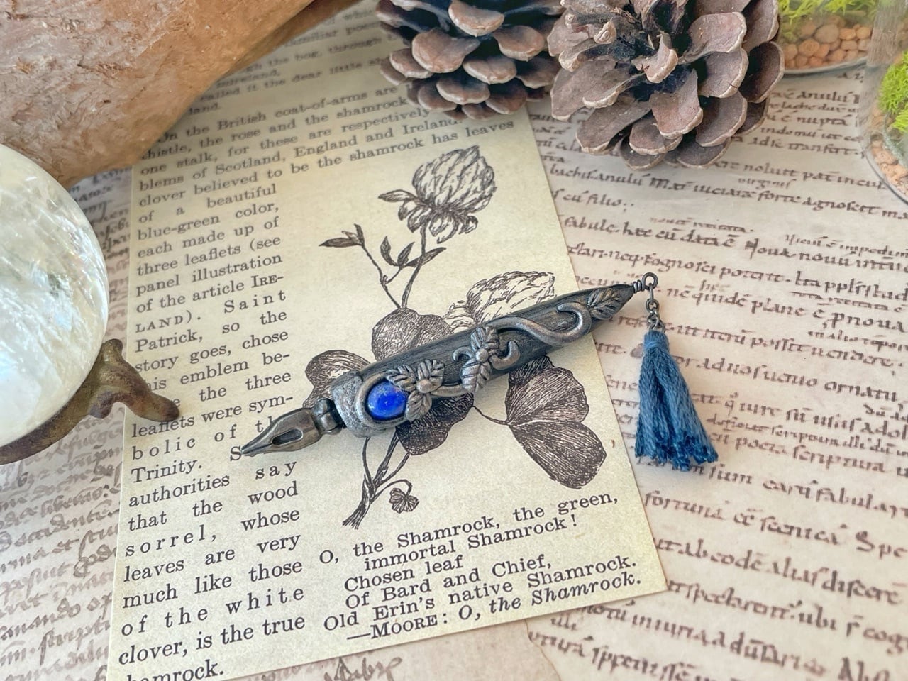 魔法式や魔法陣を描くために錬成された魔法使い用のペンを納品したところ、ジャーナリストの皆様から「いつでもすぐにメモが取れるようにコンパクトなサイズのペンを作って欲しい」との要望を受け誕生しました。ブローチ型となっておりますので、胸元や帽子に付けた状態で持ち運びできます。皆様のスクープ記事をお待ちしております♪