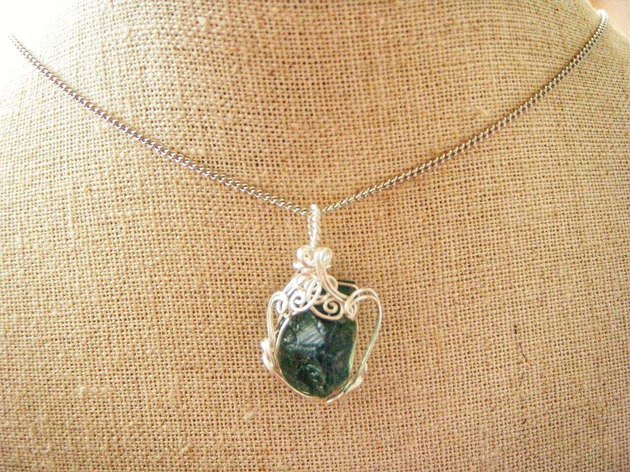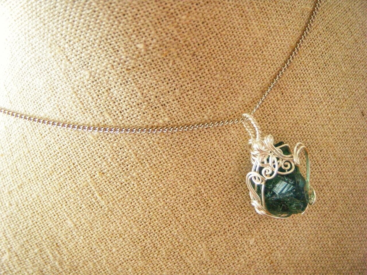 エメラルドグリーンがみずみずしいイングランド産フローライトのカケラをワイヤーで巻いてペンダントにしてみました。