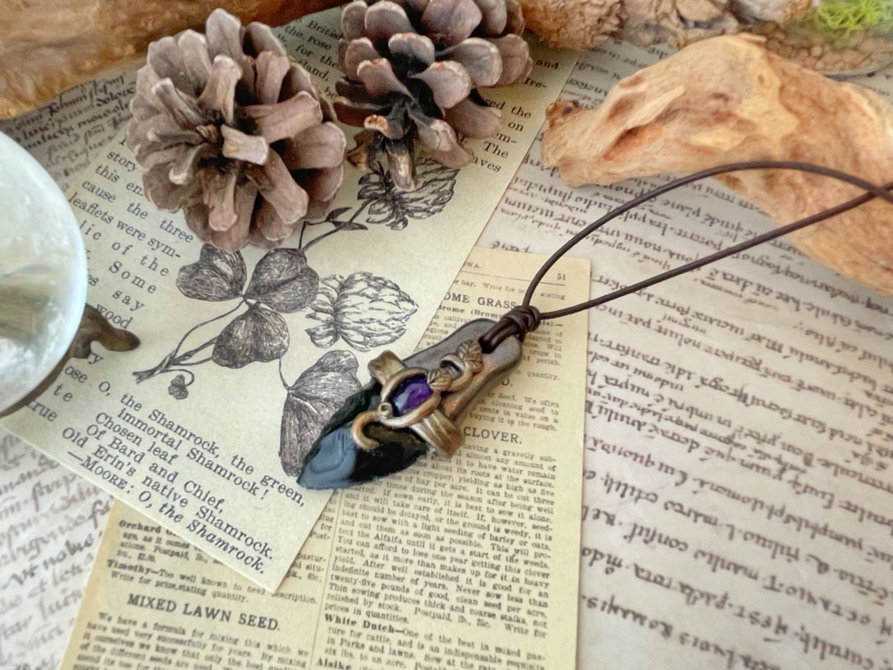 古代文明や伝説が記された古文書、装備すると不思議な力を発揮する護符・・・小さな頃に夢中になったファンタジー世界のアイテム達を、ポリマークレイと天然石で再現してみました。手に取って秘密の呪文を唱えると何かが起きる・・・かもしれません。
