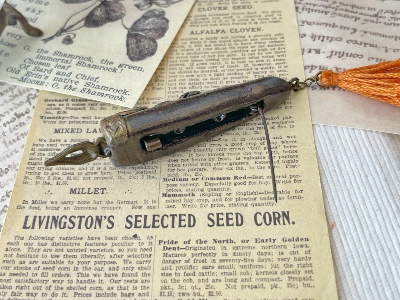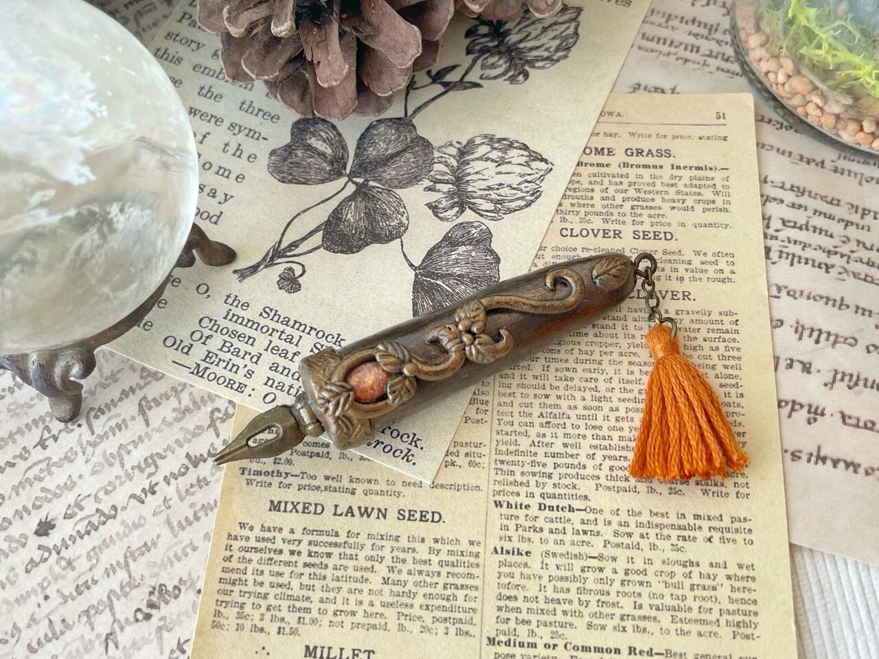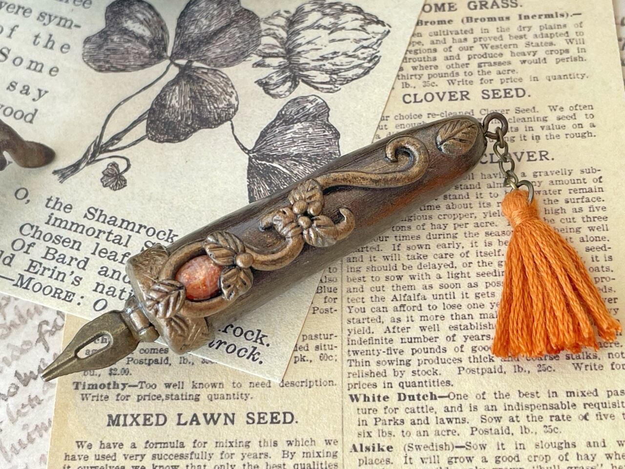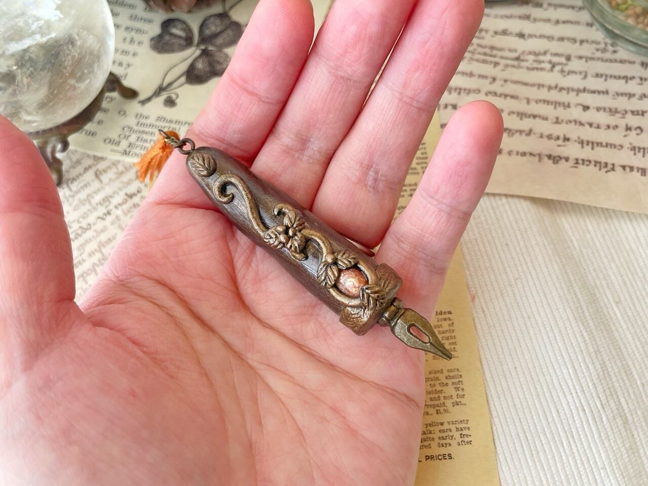 魔法式や魔法陣を描くために錬成された魔法使い用のペンを納品したところ、ジャーナリストの皆様から「いつでもすぐにメモが取れるようにコンパクトなサイズのペンを作って欲しい」との要望を受け誕生しました。ブローチ型となっておりますので、胸元や帽子に付けた状態で持ち運びできます。皆様のスクープ記事をお待ちしております♪