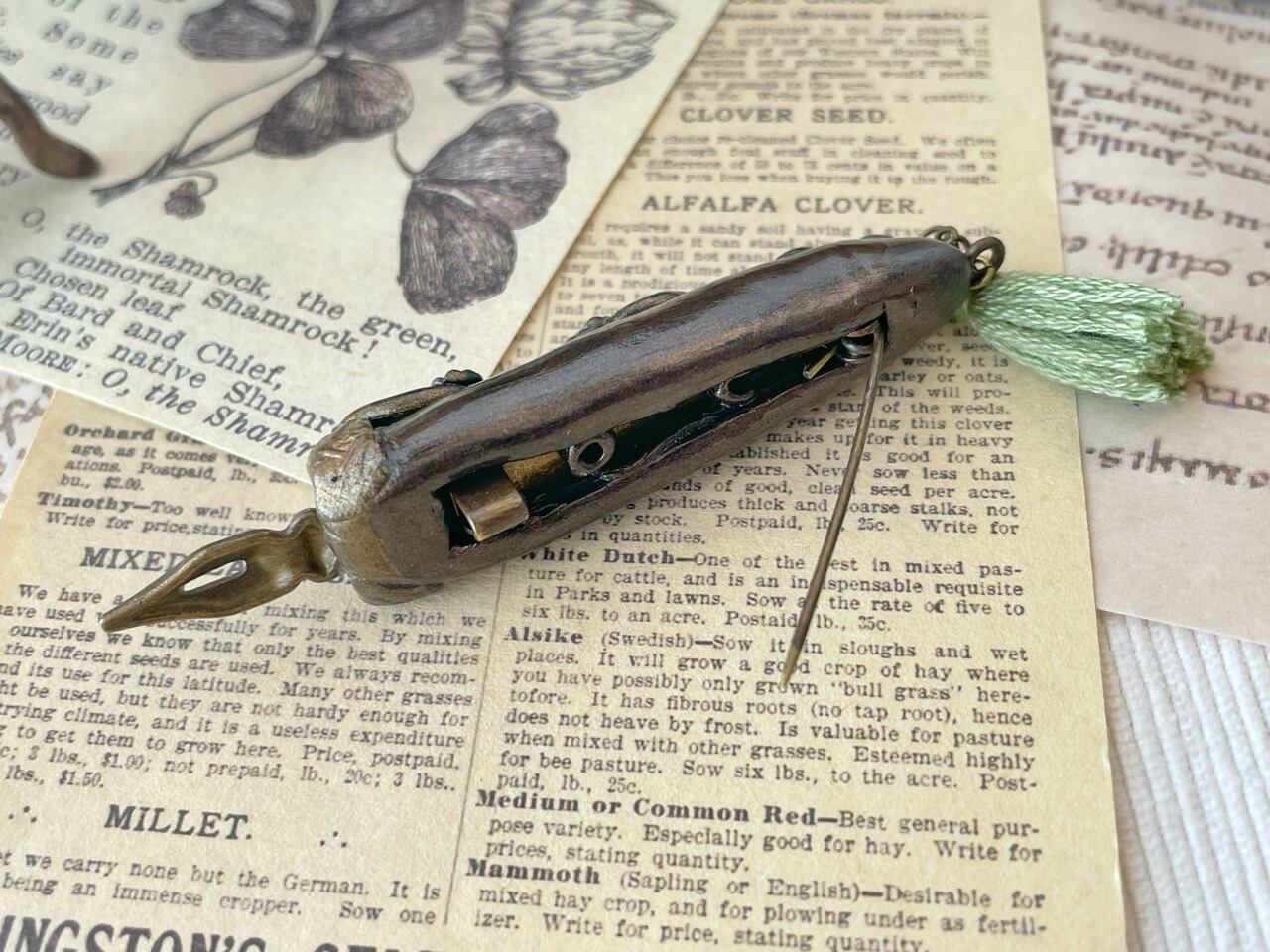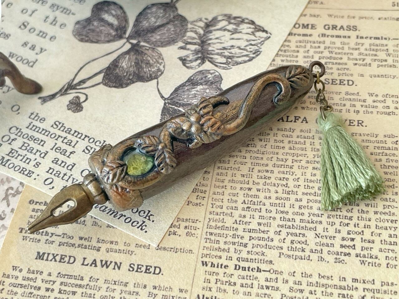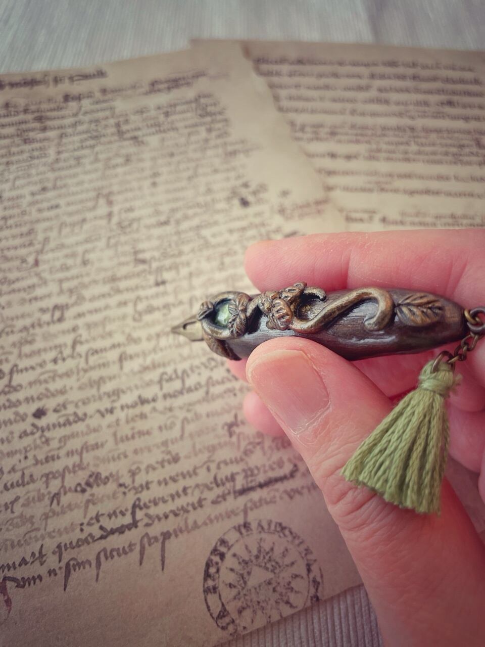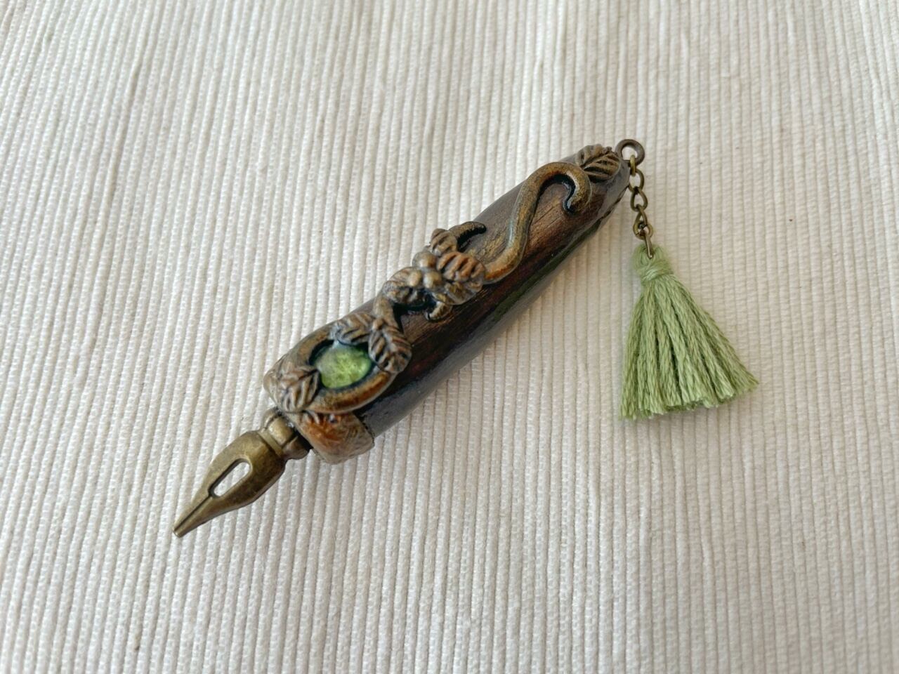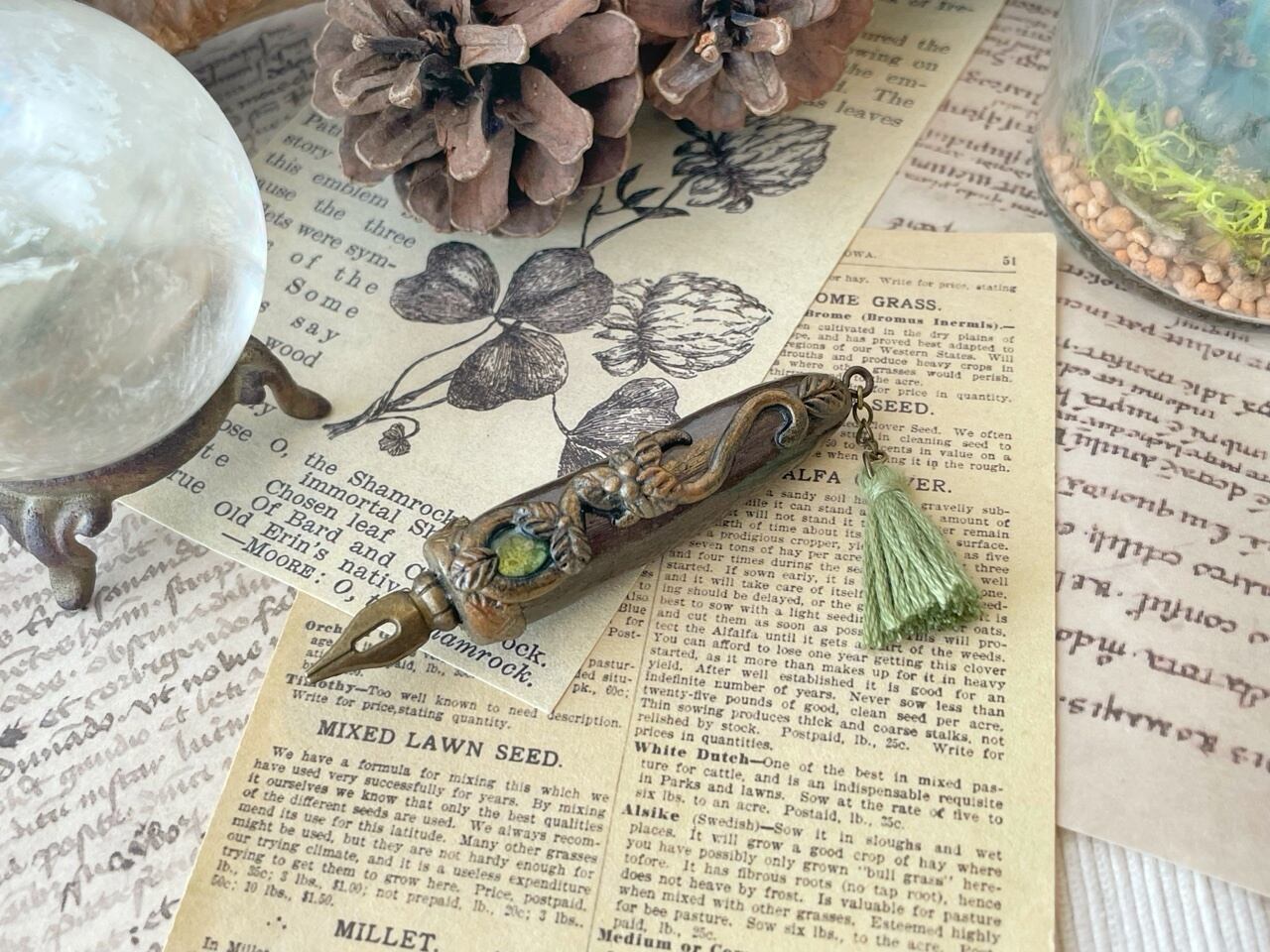 魔法式や魔法陣を描くために錬成された魔法使い用のペンを納品したところ、ジャーナリストの皆様から「いつでもすぐにメモが取れるようにコンパクトなサイズのペンを作って欲しい」との要望を受け誕生しました。ブローチ型となっておりますので、胸元や帽子に付けた状態で持ち運びできます。皆様のスクープ記事をお待ちしております♪