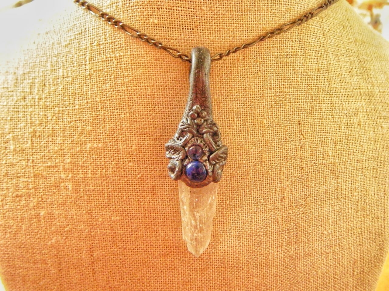 水晶の原石にラピスラズリとアイオライトのカボションを組み合わせたペンダントです。思わず冒険の旅に出たくなりそう!?