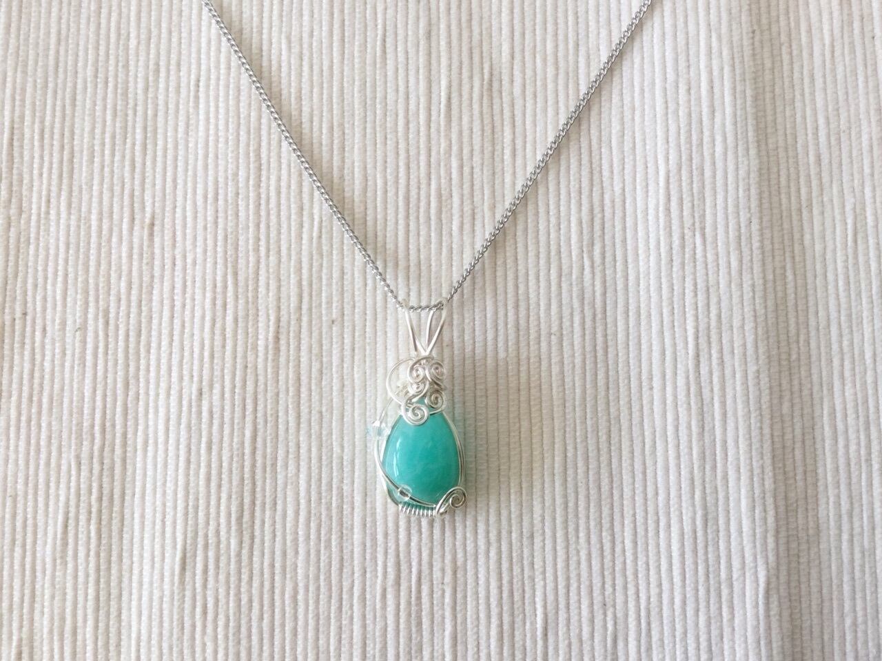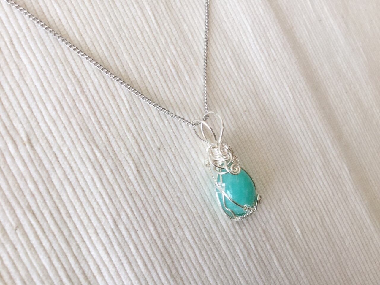 水色が爽やかなアマゾナイトをワイヤーで固定したペンダントです。