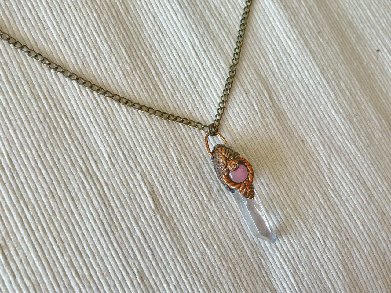 ホワイトオーラの原石にピンククォーツのカボションを組み合わせたペンダントです。思わず冒険の旅に出たくなりそう!?