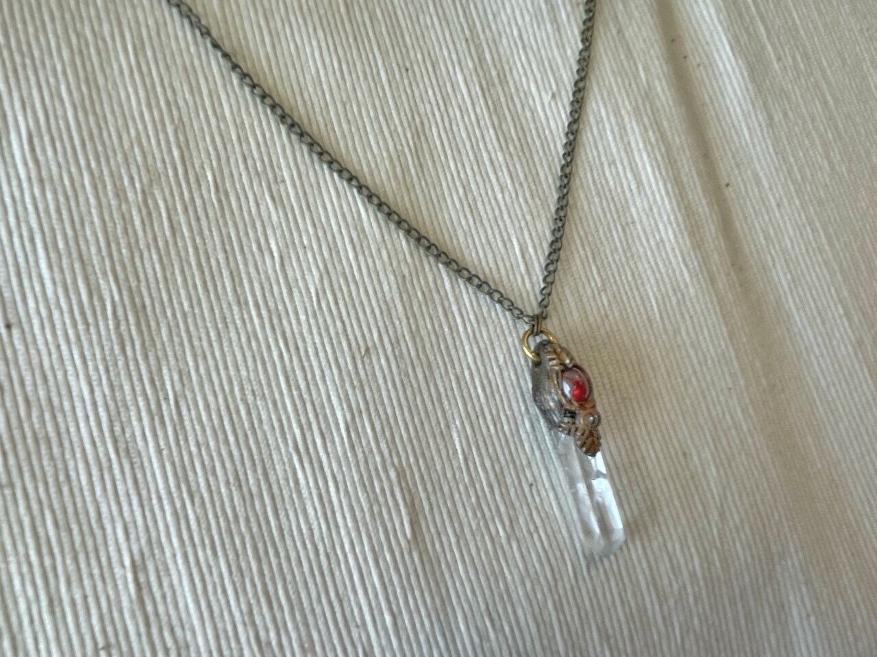 水晶の原石にガーネットのカボションを組み合わせたペンダントです。思わず冒険の旅に出たくなりそう!?