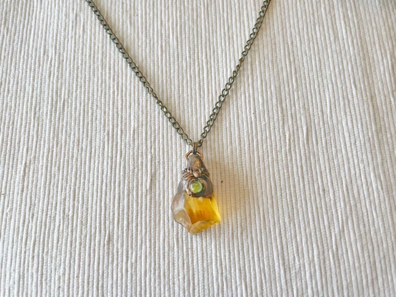 ゴールデンカルサイトの原石にペリドットのカボションを組み合わせたペンダントです。思わず冒険の旅に出たくなりそう!?