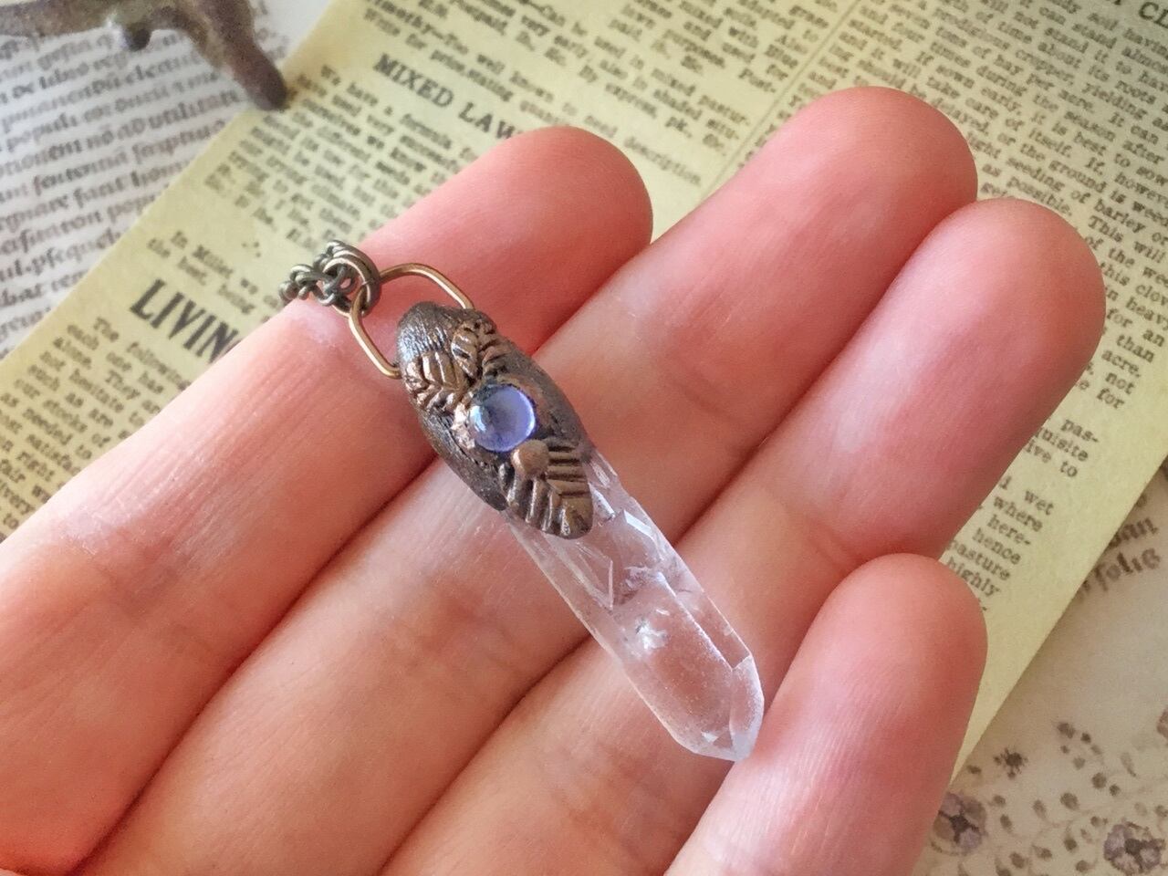 水晶の原石にアイオライトのカボションを組み合わせたペンダントです。思わず冒険の旅に出たくなりそう!?
