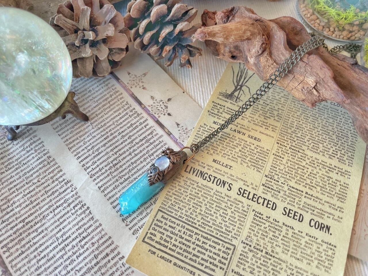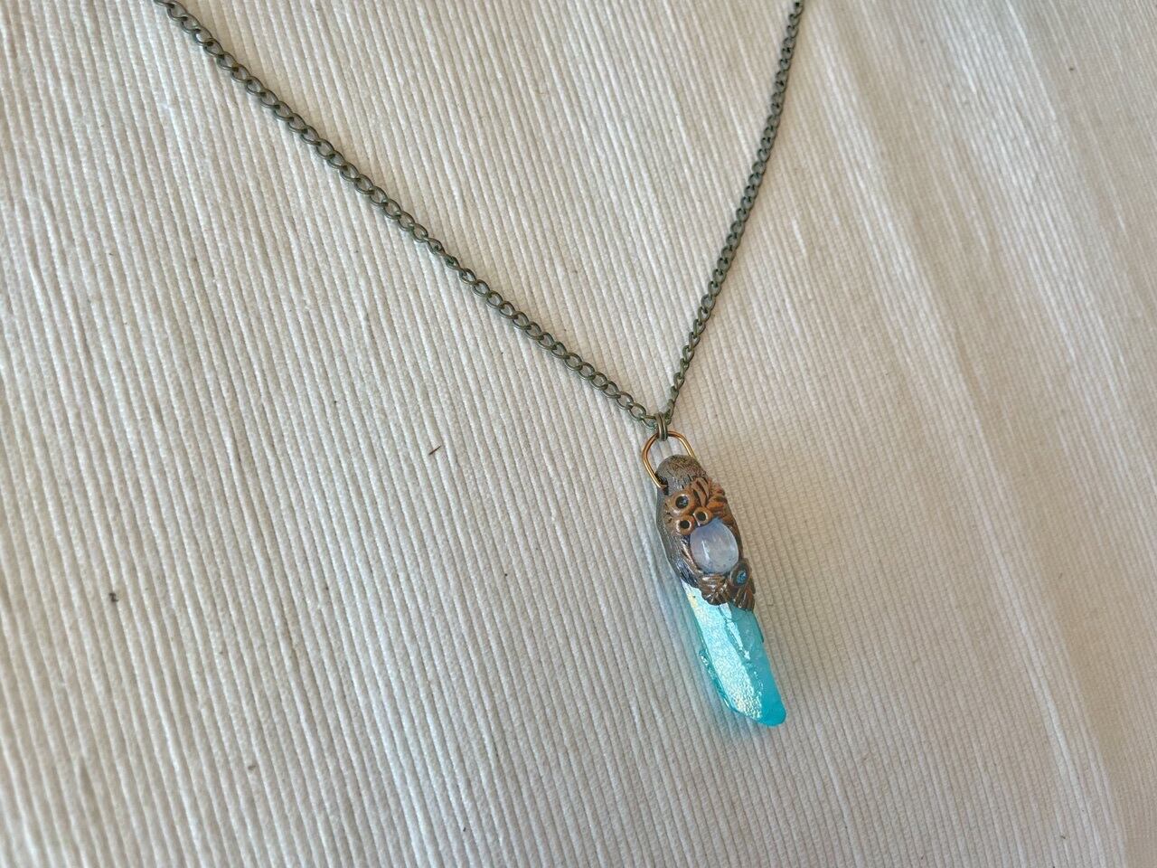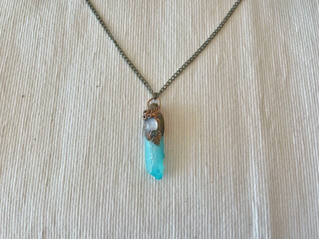 アクアオーラの原石にムーンストーンのカボションを組み合わせたペンダントです。思わず冒険の旅に出たくなりそう!?
