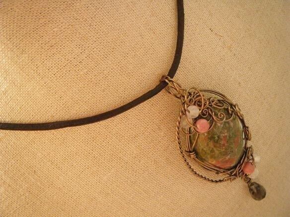 使用石:ユナカイト(カボション)、ローズクォーツ・ロードナイト(ビーズ)、スモーキークォーツ(ドロップ型ビーズ)