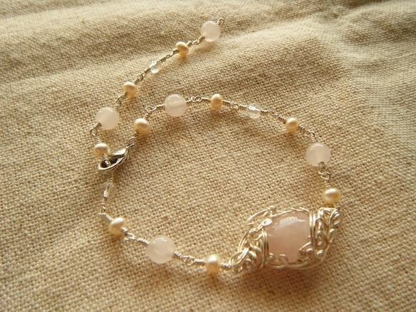 淡いピンクのローズクォーツに淡水パールを散りばめたブレスレットです。