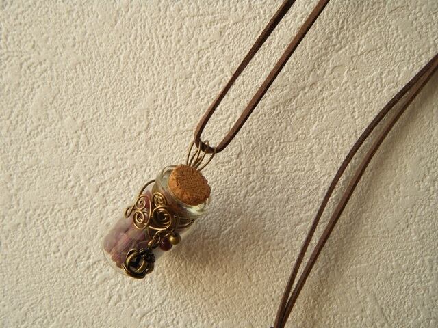 天然石の細石を小瓶に詰めたものをワイヤーで飾りました。ピューターチャームやビーズが可愛らしいアクセントに☆ お守りとして身に付けるのはもちろん、紐を外してデスクなどにチョコンと飾っても可愛いですよ♪