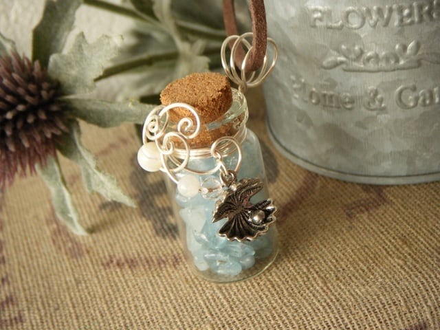 天然石の細石を小瓶に詰めたものをワイヤーで飾りました。ピューターチャームやビーズが可愛らしいアクセントに☆ お守りとして身に付けるのはもちろん、紐を外してデスクなどにチョコンと飾っても可愛いですよ♪