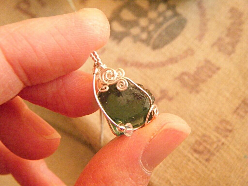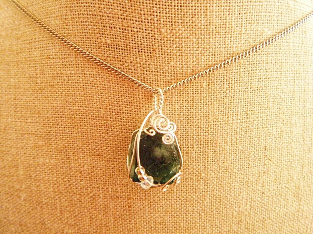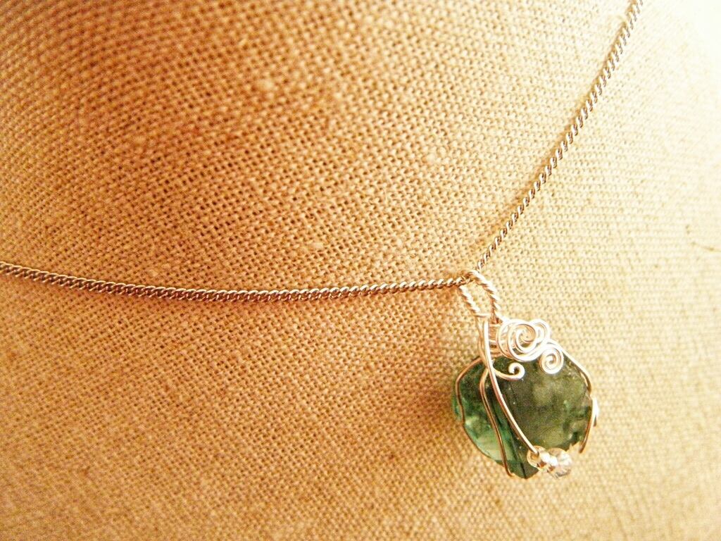 エメラルドグリーンがみずみずしいイングランド産フローライトのカケラをワイヤーで巻いてペンダントにしてみました。